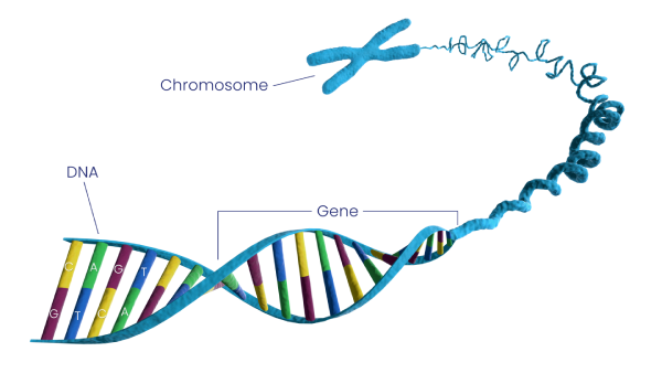 DNA is a very long and coiled molecule found in the nucleus, or command center, of a cell. It provides the full blueprint for the construction and operation of a life-form, be it a microbe, a bird, or a human. The information in DNA is stored as a code made up of four basic building blocks, called nucleotides. The order in which the nucleotides appear is akin to the order of the letters that spell words and form sentences and stories. In the case of DNA, the order of nucleotides forms different genes. Each gene contains the instructions for a specific protein.