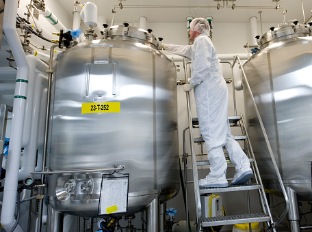 The manufacturing process begins with cell culture, or cells grown in the laboratory. Cells are initially placed in petri dishes or flasks containing a liquid broth with the nutrients that cells require for growth. During the scale-up process, the cells are sequentially transferred to larger and larger vessels, called bioreactors. Some bioreactor tanks used in manufacturing hold 20,000 liters of cells and growth media.
